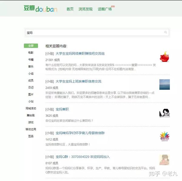 直接打开豆瓣官网,然后我们想加宝妈之类的微信群,那么直接搜索“宝妈”即可,然后直接会出现宝妈相关的小组。